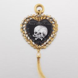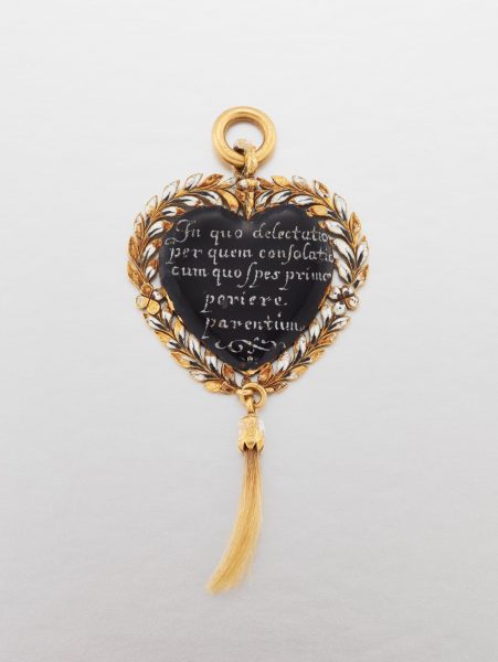 Heart-shaped and surrounded by a golden wreath the pendant jewel is enamelled in black and white with a death’s head skull and inscriptions in Latin front and back translated as: ‛Your Robert died 4th May 1624 / In whom was our delight, through whom was our consolation, with whom the hope of his parents first perished’. Beneath the jewel is a tassel of Robert’s blonde hair.